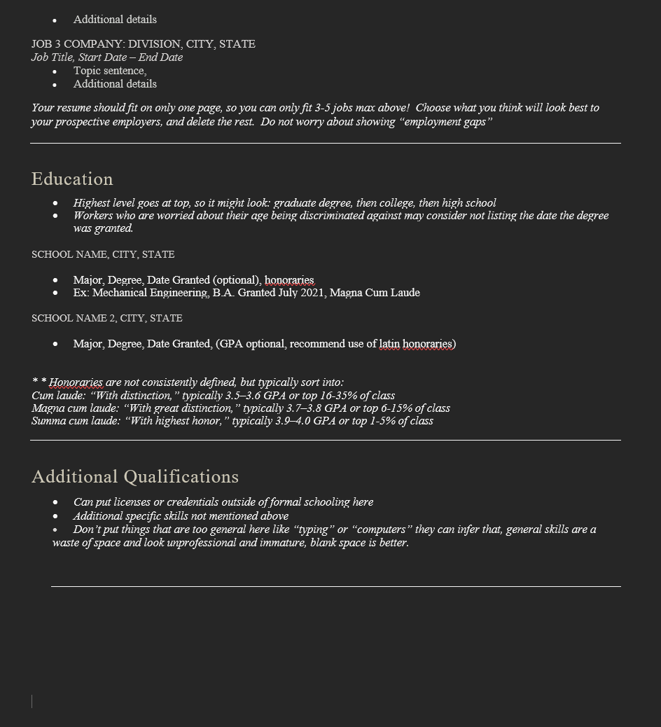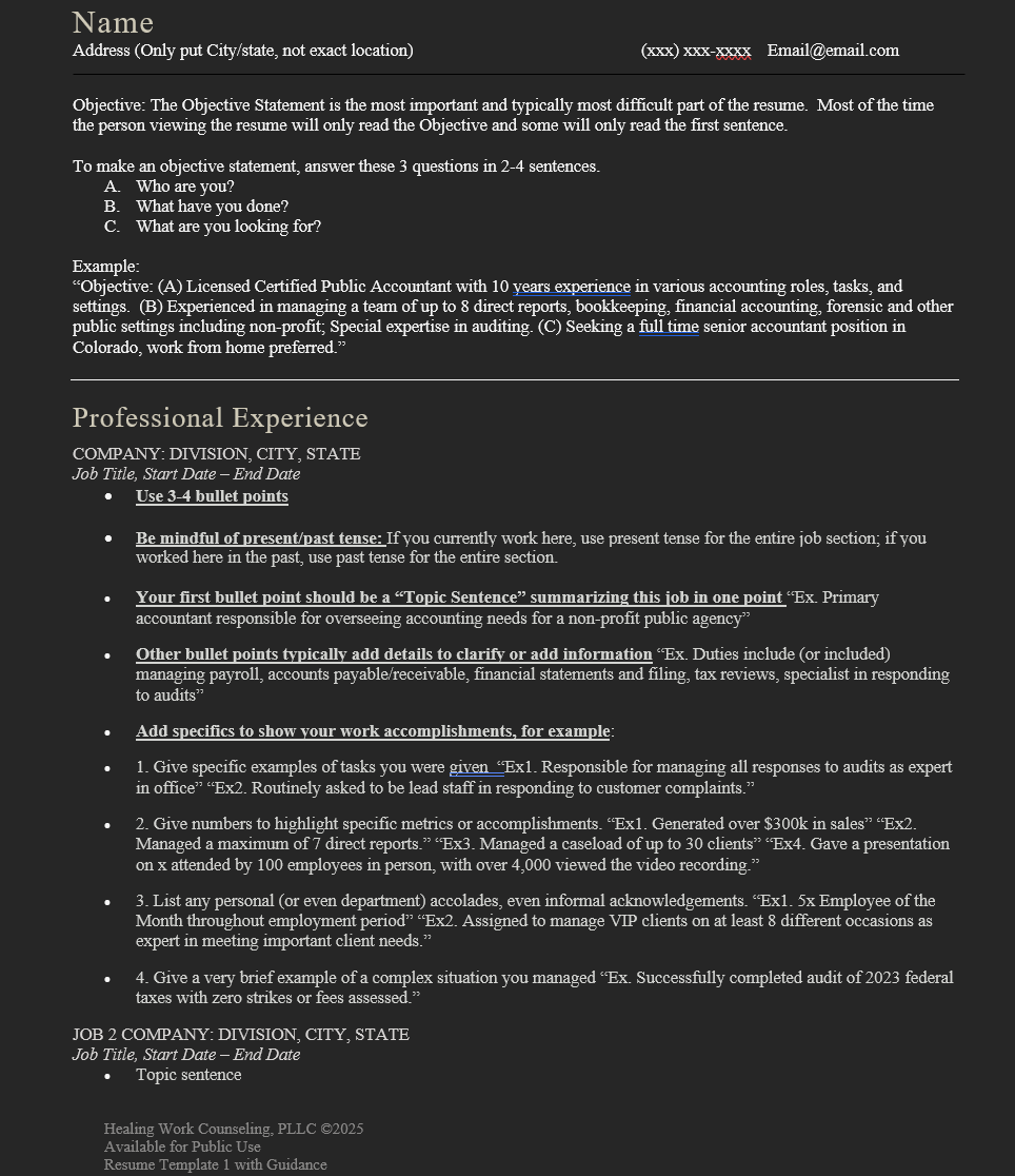 If you are using a resume template for your personal use, please be sure to remove the Healing Work Counseling, PLLC information in the footer!